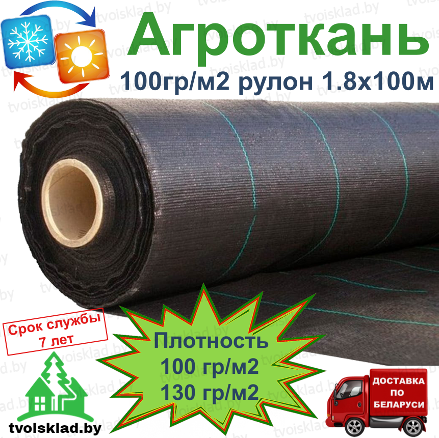 В наличии есть Агроткань плотностью 100гр/м2 и 130гр/м2, шириной 1,1 м., 1,8 м., 2,5 м., 3,2 м., и 4,2 м.